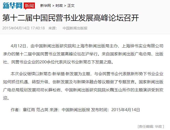 第十二届中国民营书业发展高峰论坛新闻报道
